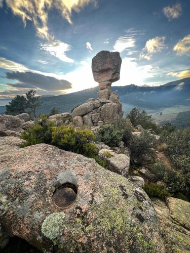 Iniciamos la ruta en Canto Cochino, punto de partida clásico en La Pedriza, donde comenzamos a adentrarnos en el caos granítico. Desde aquí llegaremos a cuatro caminos, un cruce de caminos que nos acercará al Puente de los Pollos, (un curioso arco natural de unos 15m de alto), tras una zona de bloques y trepadas sencillas. Aquí empieza la parte más divertida y aventurera de la ruta para llegar a El Pajarito que nos acercará a otra de las formaciones más icónicas de La Pedriza, El Cáliz: un bloque equilibrado que desafía la lógica y ofrece un entorno espectacular. Descenderemos por senderos entre rocas y pinar hasta volver al punto de inicio.