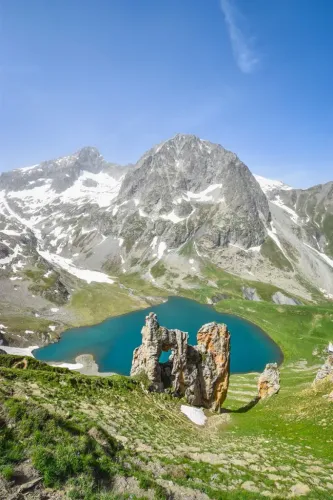 Para terminar, una ruta circular por el Plateau d’Emparis, El balcón de los Écrins famoso por ofrecer las vistas más icónicas y frontales de la Meije y sus glaciares. El punto fuerte es la visita a los lagos Lérié y Noir, donde las cimas de más de 4.000 m se reflejan en aguas cristalinas. Es una jornada de praderas infinitas y menos exigente físicamente, ideal para disfrutar del paisaje antes de volver a casa.