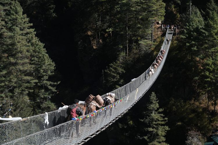 Tras el espectacular vuelo a Lukla, comenzamos el trekking con un descenso suave por el valle del río Dudh Koshi, atravesando pequeñas aldeas y puentes colgantes.