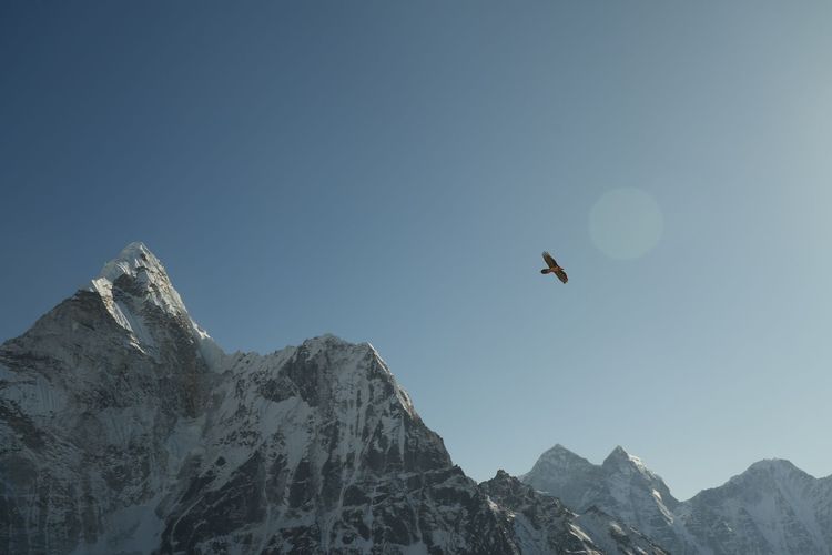 La etapa más alpina. Superamos una empinada canal de roca y cruzamos un glaciar somital antes de descender con vistas frontales al pico Cholatse. Cima en el mejor mirador del Everest al amanecer. Después, nos desviamos hacia la base del segundo collado.